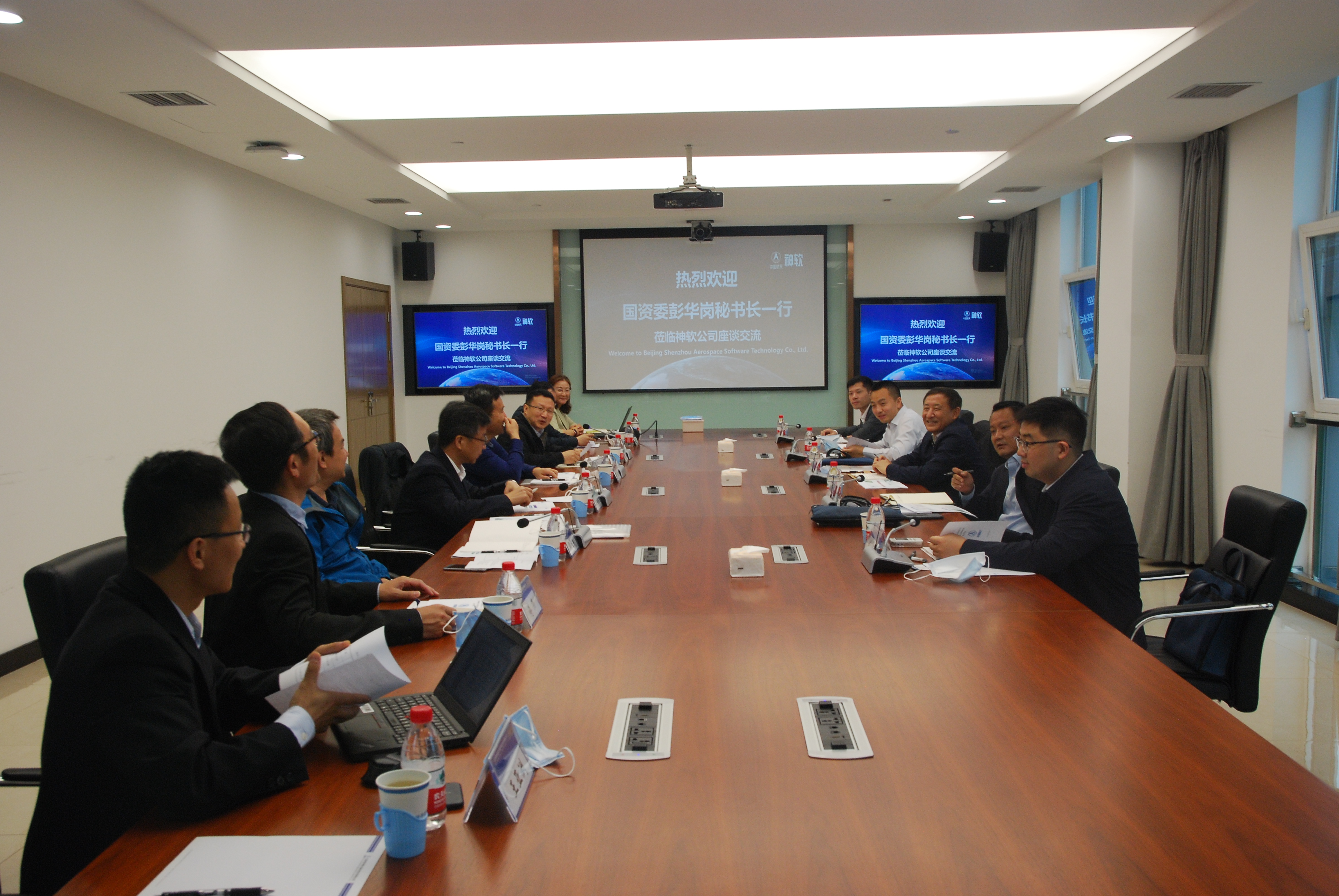2020年5月8日,国资委党委委员、秘书长彭华岗赴航天科技所属的“双百企业”北京神舟航天软件技术有限公司调研,参观企业创新验证中心,听取企业推行职业经理人制度等综合性改革有关情况的汇报,并与航天科技、神软公司有关负责同志进行了座谈交流。