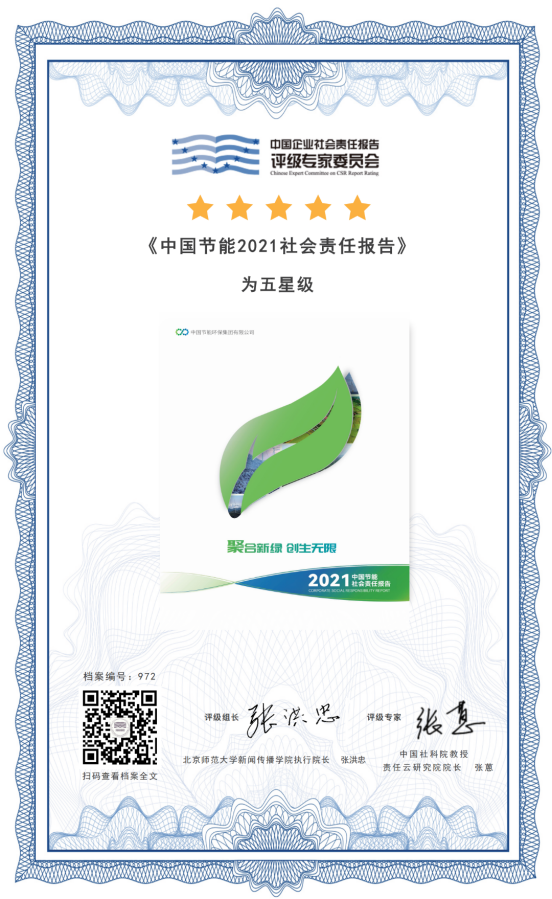 会上,集团公司发布了《中国节能2021社会责任报告》,向社会展示了2021年度中国节能社会责任管理与实践的最新进展与成果。这是集团公司连续发布的第11份社会责任报告,并连续第7年获得中国企业社会责任报告评级专家委员会“五星级”评价。集团公司荣获2022责任金牛奖“绿色环保奖”,入选2022年“央企责任管理·先锋30指数”。