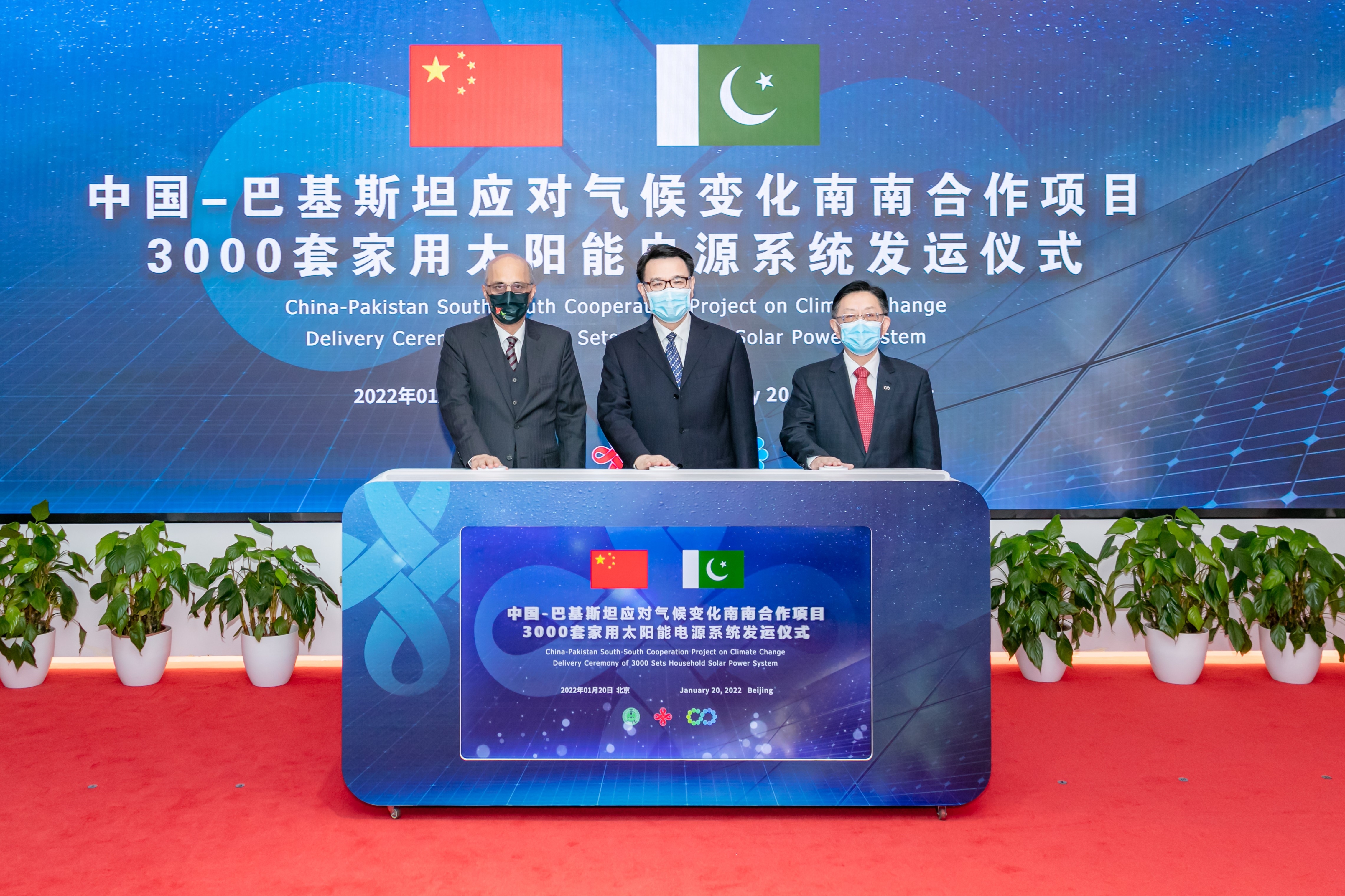 1月20日下午,中国-巴基斯坦应对气候变化南南合作项目3000套家用太阳能电源系统发运仪式在节能大厦举办。生态环境部副部长赵英民,巴基斯坦驻华大使莫因·哈克,中国节能董事长宋鑫出席活动并致辞。
